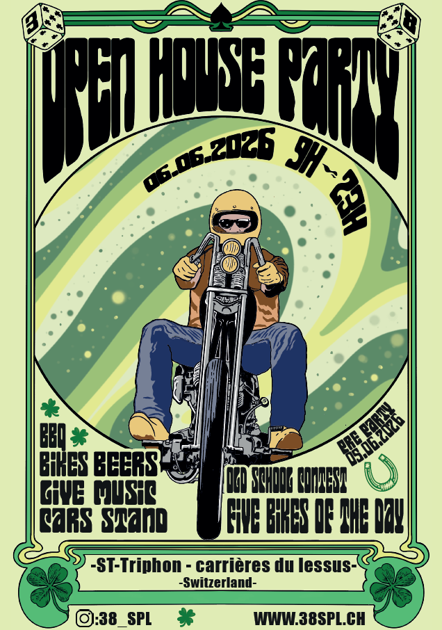 Il était une fois une bande de potes, adeptes de « kustom kulture » : le 38spl. Une poignée de bricoleurs qui retapent de vieilles brêles, juste pour le plaisir, depuis 2008. Afin de partager notre passion des belles mécaniques et des moments conviviaux, nous avons mis sur pied une « Open House Party », journée familiale ouverte à toutes et tous, qui rencontre le succès depuis sa première édition en 2011.